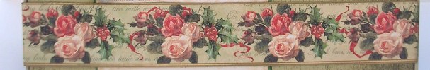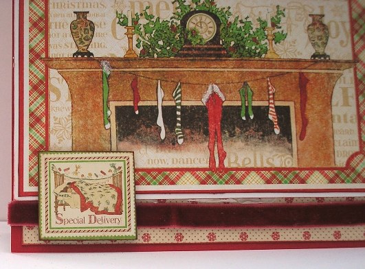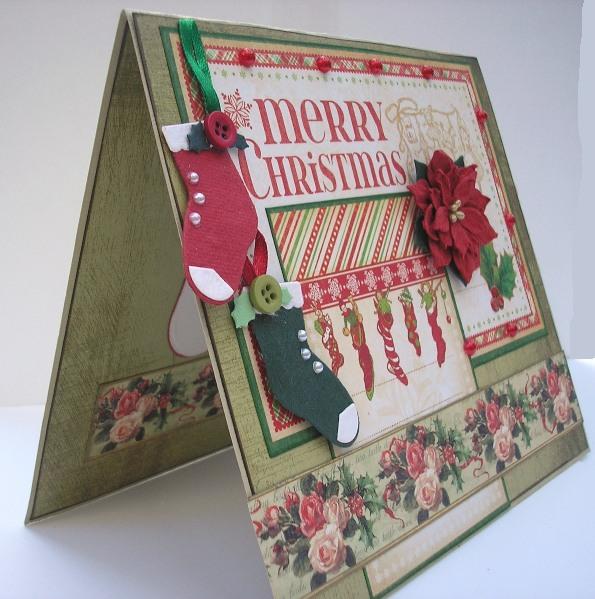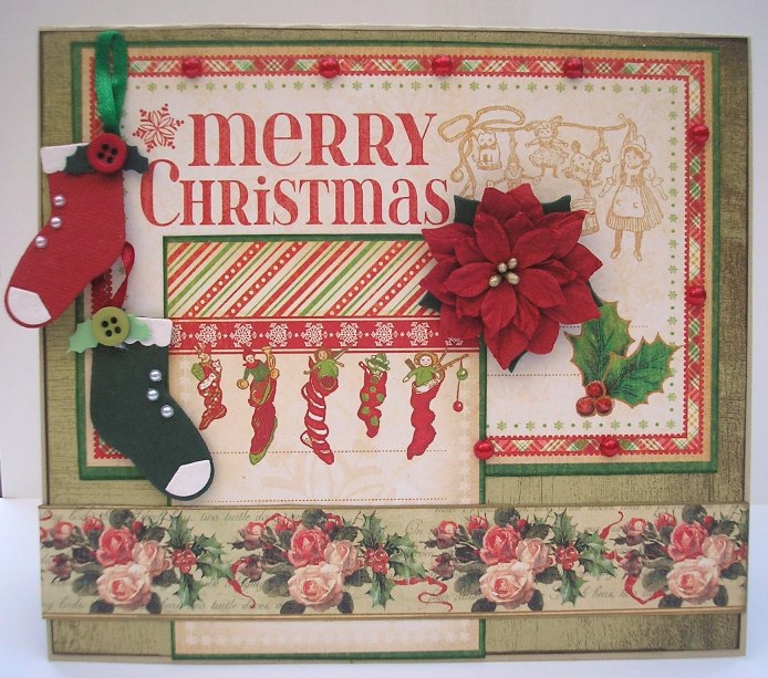 Cut and fold a piece of cardstock into a card sized 17cm (width) x 15cm (height) Cover the front and inside with Basic Grey Blitzen paper - ink edges before sticking down. Cut out the Merry Christmas image from the " Up On The Housetop" paper. Ink edges then stick onto the card at the top. Cut out the Stockings image from the same sheet. Again ink edges then stick into position (see pictures for guidance) Cut a Christmas Rose border strip from Graphic 45 Twelve Days of Christmas "Joyeux Noel" sheet.