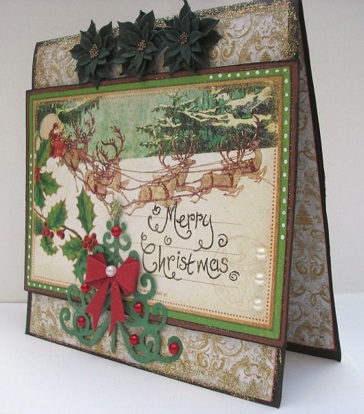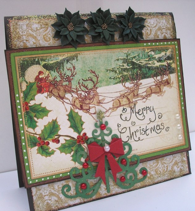 Cut and fold a piece of dark brown cardstock into a card sized 15cm x 15cm Cover the front with a sheet of paper from the Silver & Gold 6x6 Pad, or from the 12x12 sheet Cut a piece of cardstock size 15.5cm x 10.5cm. Ink edges. Cut the "Santa & Reindeer" image from the "Up on the housetop" sheet, ink edges then mount it onto the cardstock. Dot with a white pen, I used a Sharpie marker. Write or stamp a sentiment. Add this piece to the middle of the card front. Add glue from, say, a glue stick, around the exposed edges of the main card, then sprinkle with Gold Glitter - I used Gold Glamour Dust. I wanted a heavy coverage. Add three poinsettias to the top. Cut a Christmas tree from the Sweet Dixie die. Glitter the star, I used Gold Stickles. I also sprayed my tree with a shimmer spray, although it doesn't show up in the pictures. Glue tree onto card, then add red pearls and a red paper bow.