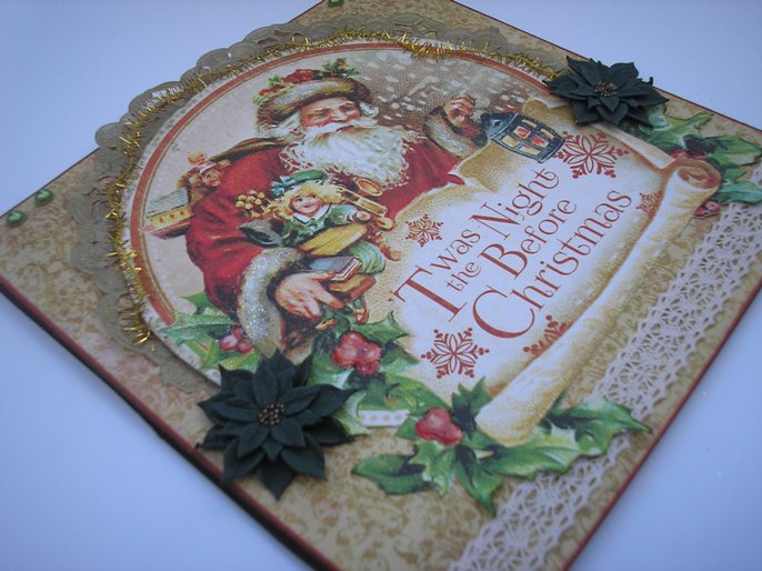 Cut a piece of cardstock into a card size: 15.5cm x 15.5cm Cut a piece of patterned paper size 15.2cm x 15.2cm. Ink edges then stick onto the fron of the card. Cut a piece of Basic Grey paper into size 9cm x 11cm (width). Ink edges, then stick onto front (see pictures for guidance). Add a strip of cream lace, and a paper border strip from the Ho Ho Ho paper Cut out the smaller "Twas the night Before Christmas" image from the Jolly Old Elf paper. Rough up the edges of the circle, then stick it onto the mat as pictured. Add a Gold Satin Vivant Perle Tag. Used double-sided tape to attach parts of the centre, and add a green Gumdrop brad at the top. Add three poinsettia and three green pearls.