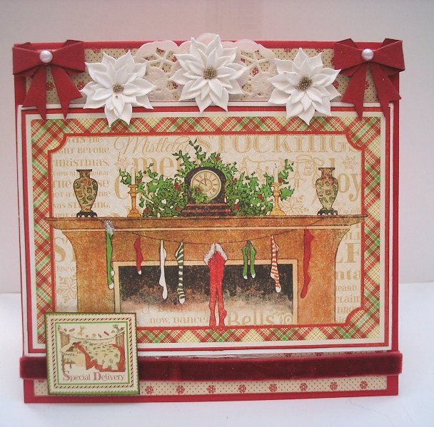 I used Plain Cardstock Graphic 45 Twas the Night Before Christmas "Long Winter's Nap" paper Graphic 45 The Twelve Days of Christmas paper (From the Patterns & Solid Pad) White Poinsettia Red velvet Ribbon White/crystal Stickles Cut plain red cardstock into a card size 16.3cm (width) x 15.3cm (height) Cut two pieces of Graphic 45 Twelve Days of Christmas paper into size 14.5cm (height) x 15cm (width). Ink edges with red ink, then attach one to the front of the card, and the other to the inside of the card. Stick on a small white doily to the top of the card (see pictures for guidance). TIP: use just the part you need, save what isn't showing for another card. Cut the appropriate image from the "Long Winter's Nap" sheet and mount this onto white cardstock. Mount onto foam tape, then stick onto front of card. Embellish with a piece of red velvet ribbon at the bottom, and poinsettias and bows to the top. Add Stickles to parts of the stocking. Cut a stamp from the "Ho Ho Ho" sheet. Ink edges then mount on foam tape and stick to card (see pictures for guidance)