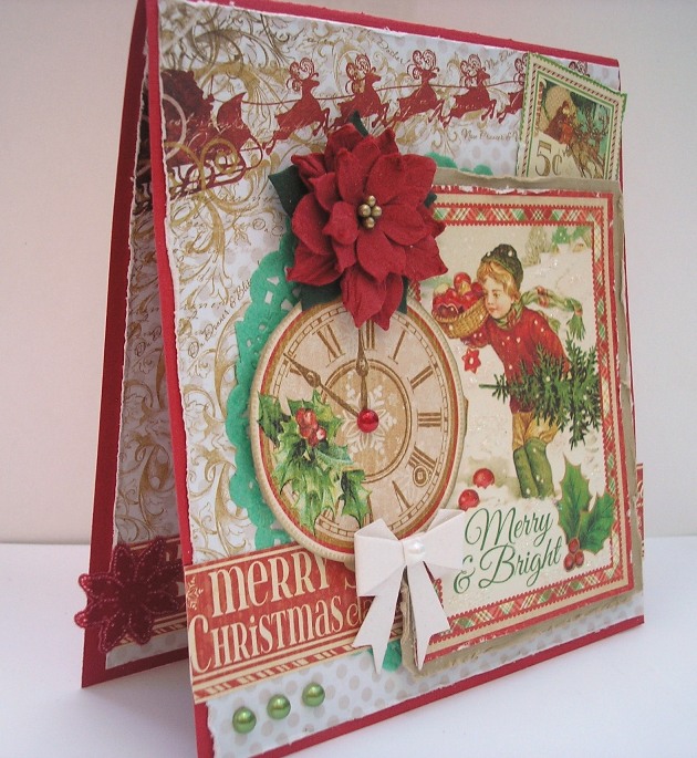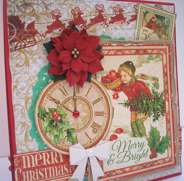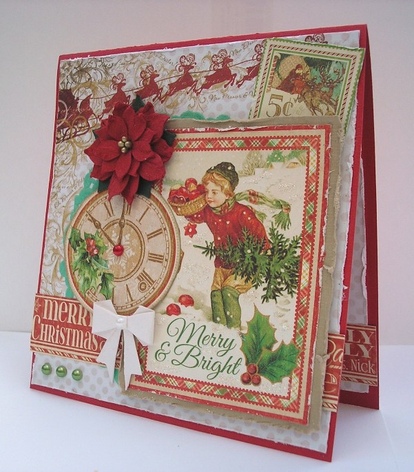 Cut and fold plain red cardstock into size 14cm (width) x 15cm (height) Cut two pieces of Silver & Gold paper into size 14.5cm (height) x 13.5cm (width). Scuff edges with a distresser, then stick one piece on the front of the card, and the other on the inside of the card. Stick a green doily onto the front of the card, slightly towards the left and down a bit, so that it is mostly on the bottom left-hand side (see pictures for guidance). Add a border strip cut from the Ho Ho Ho paper to both the front, and the inside of the card (see pictures for guidance). Cut it so tha you get the sentiment you want for the front. Cut a Stamp from the Ho Ho Ho paper. Scuff edges, then stick to the right-hand side (see pictures for guidance) Cut the Merry & Bright image from the "Long Winter's Nap" paper and mount it on plain cardstock. Scuff the edges of the cardstock. Cut a small clock from the Jolly Old Elf paper, and stick it onto the Merry & Bright image. Mount on foam tape and stick onto card so that you can see parts of the doily (see pictures for guidance). Add a large poinsettia. Add crystal stickles here and there to the image for glistening snow effect Add glossy accents to all berries and apples on images. Add a white bow with pearl, three green pearls to the bottom of the card, and one red pearl to the middle of the clock.