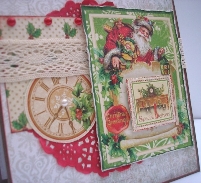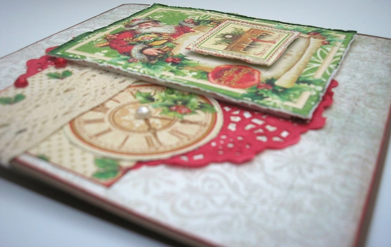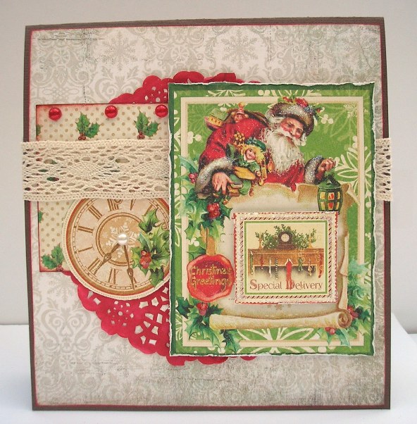 Cut and fold a piece of dark brown cardstock into a card size 14cm (width) x 15cm (height) Cut a piece of the Basic Grey paper into size 14.5cm (height) x 13.5cm (width). Ink edges with red ink. Stick onto front of card. Stick a small red doily to the middle of the card, Cut a piece of the "Jolly Old Elf" paper into size 5.5cm x 5.5cm (we are using the reverse side here, NOT the clock side) . Ink edges with red ink, then stick onto left-hand side of card (see pictures for guidance) Cut a small clock out from the "Jolly Old Elf" paper, Scuff edges gently then stick on card (see pictures for guidance). Add a strip of wide cream lace across the width of card. Cut the appropriate image from the "Up on the Housetop" paper, and the stamp from the "Ho Ho Ho" paper. Mount the stamp onto foam tape then stick onto the Santa image. Scuff edges of the image with a paper distresser then mount on foam tape and stick onto card (see pictures for guidance). To finish embellish with a few pearls and glitter. I also added some Glossy Accent to the red berries.