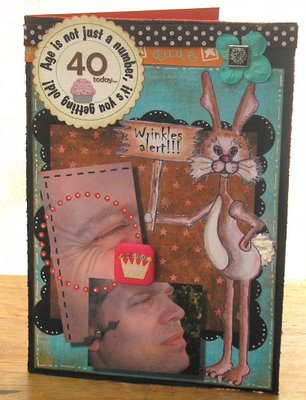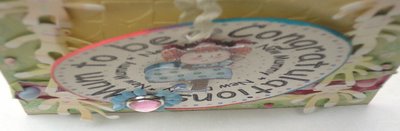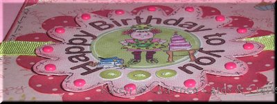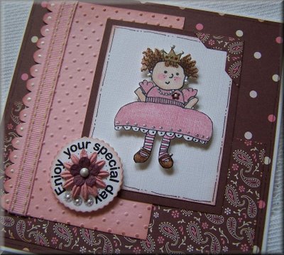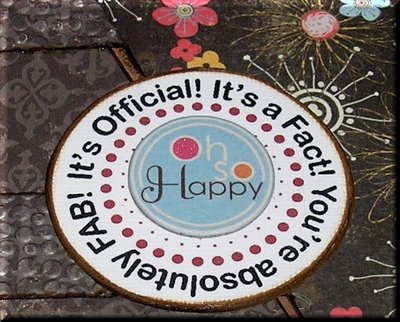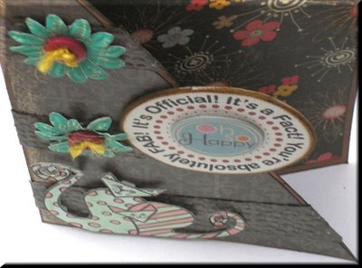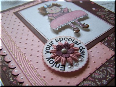 Other products used: Page Corner Cats download - Cuttlebug Embossing Folder "Tiny Bubbles" - Sheet of Prima double-sided paper Harmony "Lil Melody" paper - Brown Bazzill Cardstock - Tim Holtz Brown Distress Ink - Imaginisce "Oh so Happy" Chipboard circle - Prima Flowers and Buttons Galore buttons used on first close-up. Sentiment circle was mounted on chipboard.