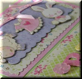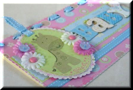 | Products used: Imaginisce "Baby Powder" Collection and K & Company Baby Adhesive Chipboard Instructions Don’t be fooled by this card, it’s surprisingly easy to make.