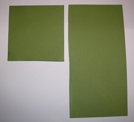 Decorate the card front first so take the 1/4 (measuring 6" x 6") and add a panel cut from Evergreen paper - leave a margin around the edge to show the green card. Ink the edges of the Evergreen panel before sticking it on.