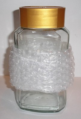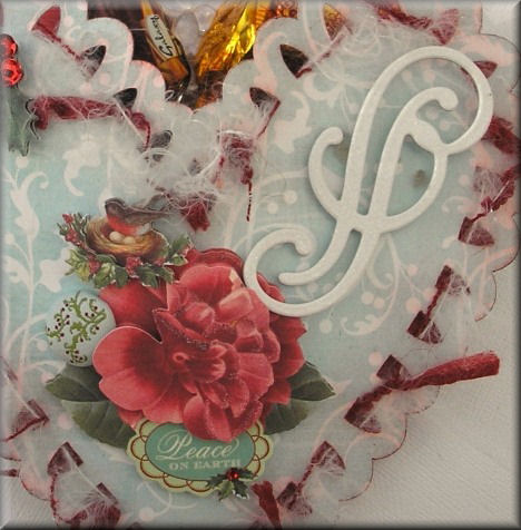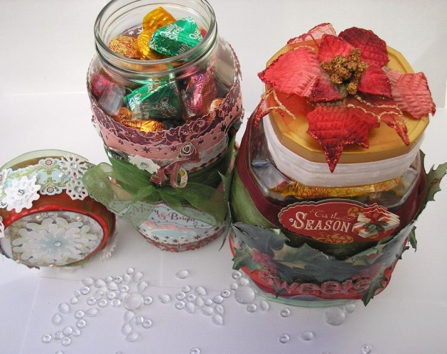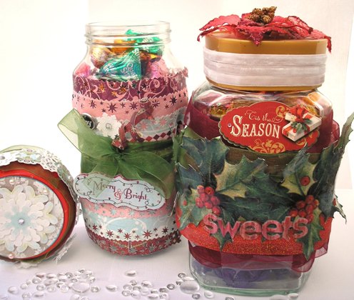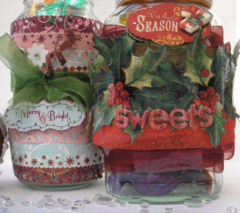 I used large jars here (I drink a lot of coffee!!) and both had an undulating shape which wasn't the easiest thing to cover. With the left-hand jar I layered papers and then using ribbon I pulled them in to show the shape of the jar. With the second jar I filled the space with bubblewrap then covered with sheer red and green ribbon.