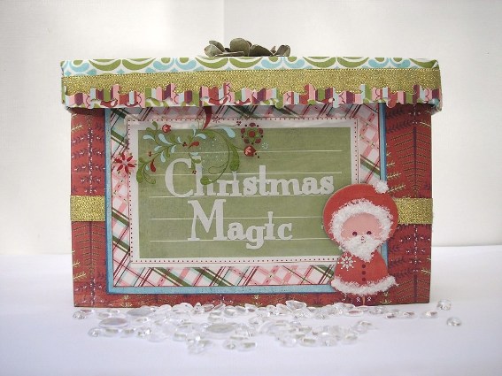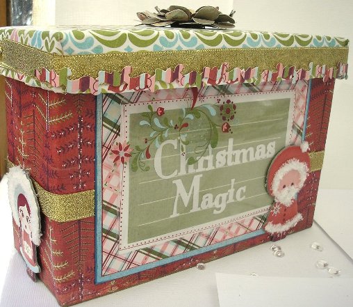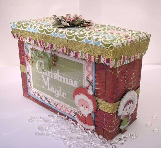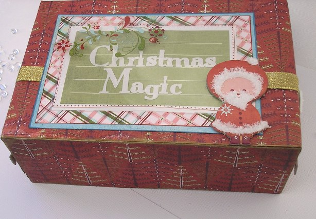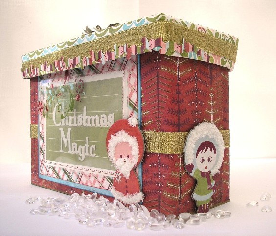 Make a lid from the cardboard and cover it with Snow Cap paper - this time use the reverse side of the paper. Again cut pieces of extra cardboard and cover with Blitzen paper to line to lid. Add a metallic gold ribbon around the edge and an Eskimo Kisses Border from the Element stickers.