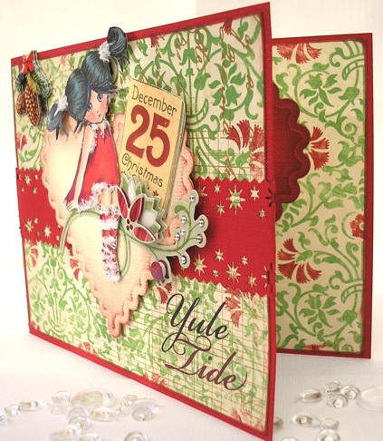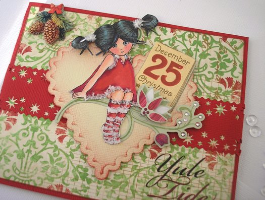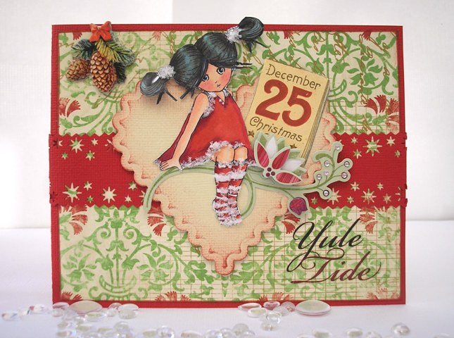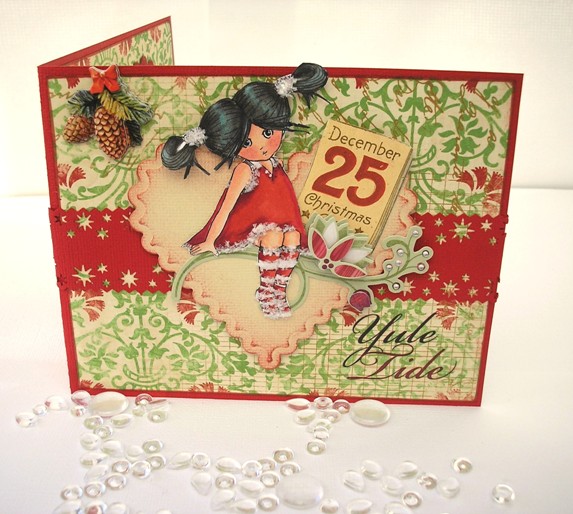 Special tools: Instructions Stamp and colour in the Annie Sitting Pretty image. Use Flowersoft Polar White to make white fluffy trims, I added it on Annie's hair bands, her socks and her dress. Cut Annie out completely. You may find it easier to cut out first before adding the Polar White trim. Make a base card using red cardstock. Cut into size 12" x 4.75" to fold into a card size 6" x 4.75". Cut three panels of the Mistletoe paper to size 5.8" x 4.55. Ink edges lightly with red ink. Stick one of the panels to the front of the card so that you have a margin all around showing the red card. Taking a piece of the red cardstock 1.5" wide and punch a star edge on both sides. Save the stars you punch out, they make smashing embellishments for other projects. Glue the star border to the middle of the card taking it around the corner inside the card. Glue the other two panels you made earlier inside the card (see picture for guidance). Using cream cardstock cut a large heart shape for the front of the card, I used a Heart Nestabilities die and embossed it too. Using a piece of the red cardstock do the same to make a heart for the inside of the card and stick it on - you can add a sentiment later of you wish. Ink edges of both hearts with red Distress ink. TOP TIP: Best way to do this is to use a dry brush and gently brush the ink on using a sweeping movements. Experiment on a scrap bit of cardstock until you are happy with the result. Elevate on foam pads or tape and stick your heart onto the front of the card (see picture of guidance). Add a Basic Grey Pops sticker and sit Annie on it. Cut out a "December 25 Christmas" from the Bo Bunny St Nick Cut-out sheet and stick it to the card (see picture for guidance). Add a Pine cone decoration from the K&Co Evergreen Chipboard shapes pack and a Imaginsce Yule Tide rub-on in the opposite corner.