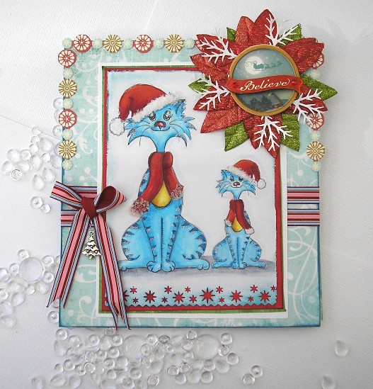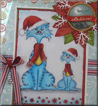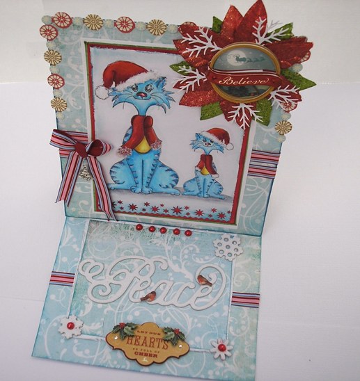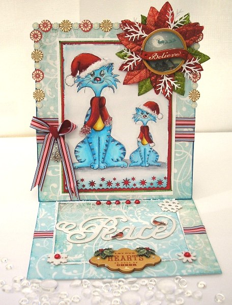 Another easel card, told you I liked them :-) You can see how to make it here on my earlier card. This time I have made the main card part taller (6.5" x 6"), but the frame remains the same size as before. Card Front: I am using one of the digi-stamp download images from our Charming Christmas collection - the Christmas Cat. I have used him twice here with one image smaller than the other. The first one is 4.5" tall whilst the second is 2.5" tall. I have also rotated the smallest cat so it's a mirror image. Sit the two cats side by side and print them out on heavyweight paper. Colour them in then add a little crystal or Icicle Stickles to them here and there. Add Flowersoft Polar White to the hats and scarves. Cut out a rectangle around the cats and punch one border (I used a Martha Stewart Star punch). Distress the edges by first inking then roughing them a little. I used a Tim Holtz Paper Distresser but you could just use your fingernails. Mat on red cardstock, then on green cardstock and finally on white cardstock. Cover the front and back of the card in Basic Grey Eskimo Kisses - I used the reverse of the Rooftop paper. Ink edges with blue Distress ink. Add two strips of Imaginisce Polar EXpressions Ribbon to the middle. Stick your cats to the middle of the card. Add a K&Company Evergreen Adhesive Border to the top of the card (see pictures for guidance) Make an embellishment using three poinsettia parts from Imaginsce Polar Expressions collection and topping with punched pine leaves and a K&Co Evergreen Grand Adhesion Stick securely to the top right-hand corner of the card. Add a bow and a little charm. Now on to the frame: Cover the frame in the same Eskimo Kisses paper as shown in the pictures.. Stick your card front to the frame (see previous card example for details on how to do this). This time I am adding the area where I write my greeting to the back of the card and leaving the front just as decoration. So decorate the front panel by matting another piece of Rooftop (reverse) paper onto white cardstock and sticking it down on top of another piece of the Polar Expressions ribbon. Add K&Co Evergreen Chipboard Word "Peace" and snowflakes from the same pack. The Mat will act as a stopper to the main card but to be sure I also added some pearls. I didn't have any in a Christmas red so coloured in some white pearls with a red marker pen. Add an Evergreen Grand Adhesion to the front "Let our Hearts be full of Cheer". Make a panels for the back of your card where you can write your greeting - you can see the picture of that here.. I matted a white panel onto red cardstock and embellished with more ribbon and a K&Co Evergreen Chipboard stocking. The panels were cut using Nestabilities and embossed for effect. Stick it on securely with double-sided tape.