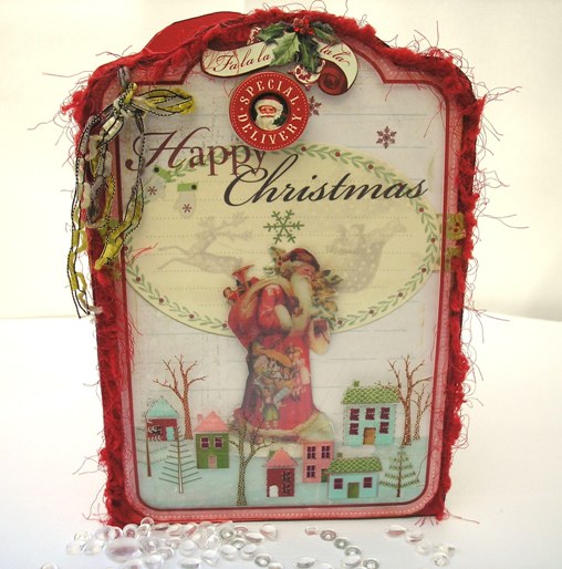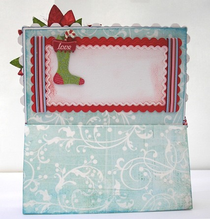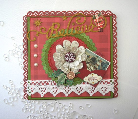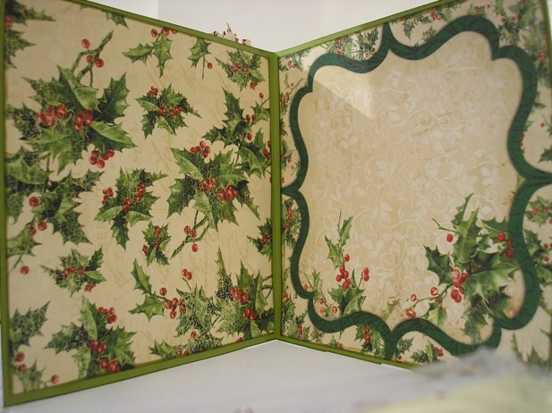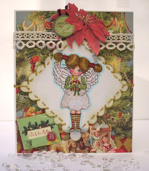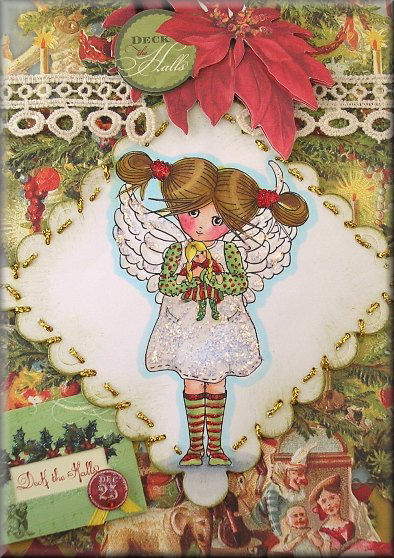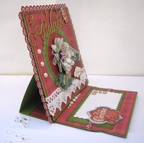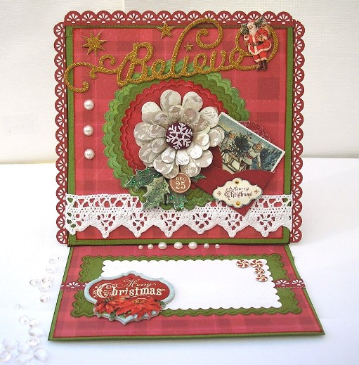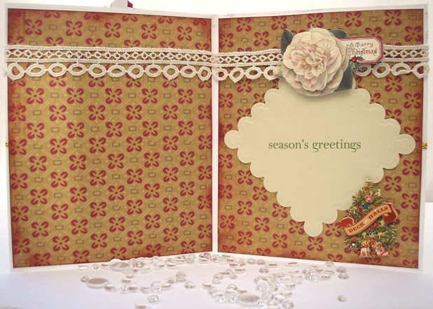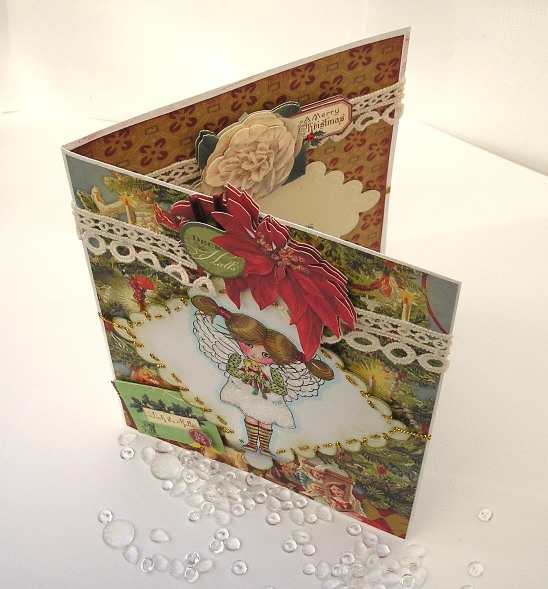Instructions The Evergreen collection by K & Company contain some gorgeous products. I used one of the papers from the Speciality pad for both the front and the inside of my card (the paper is double-sided and one sheet will easily do the job). Stamp and colour the Angel Annie image. Glitter with Stickles glitter glue for a little sparkle, I used Icicle, Red and Green Stickles. Cut out around the image using a square Nestabilities die but turn it so that you get a diamond shape - if you haven't got Nestabilites then just cut a scalloped square. Ink edges with green distress ink. Prick all around the edges of the image then sew using a gold thread. Leave the thread hanging loose either side (see picture for guidance), we will want to carry the thread around the sides of the card later. Put foam tape all around the edges so that when we stick it on the card it will be elevated. Put the centrepiece aside for later. Cut the main panel for the front of the card using the Christmas tree paper from the Speciality Pad. I cut mine to size 18cm x 14.8cm so this is a nice big card. Cut a piece of plain white cardstock to make the base card, make it marginally bigger in size than the panel x 2. Mine is approx size: 30.5cm x 18.4cm then folded on the longest length. Stick the tree panel onto the front of the card. Remove the backing tape from the Stamped centrepiece you put aside earlier and put it on the front of the card. Take the gold thread either side and take it right around the card so that the back has the thread going right across it and into the inside of the card on both sides. Stick it down inside the card. Don't worry about it showing as we will cover the edges in a mo. Cut two panels to fit inside the card from the reverse of the tree paper, ink edges with Red Distress ink then stick them to the inside of the card (see pictures for guidance). Cut and emboss another square using the Nestabilites die (or similar) and stick it to the inside of the card. Add a rub-on sentiment. Take your Prima lace and starting from the top of the diamond on the front take it right around the card finishing on the other side of the diamond panel on the front of the card - more or less where you started. Add Evergreen Grand Adhesions on the front and inside of the card (see picture for guidance) Add an Evergreen Memory Pocket to the front of the card.