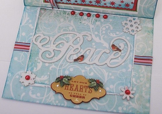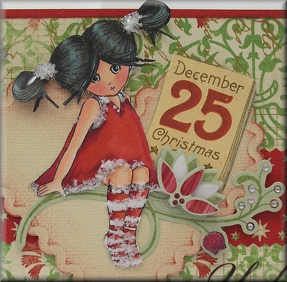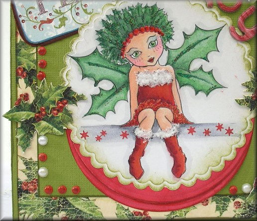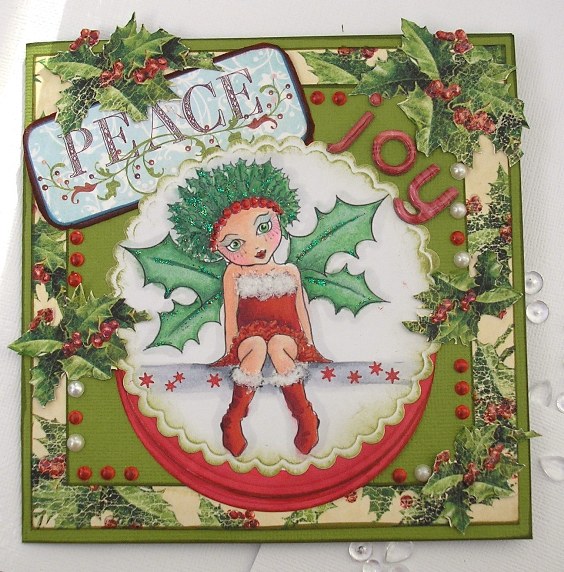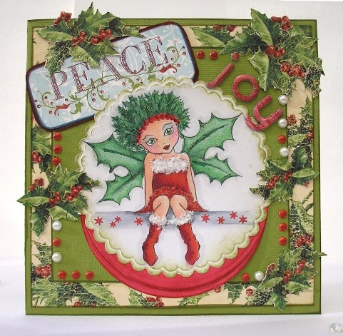 Instructions Cut a card using plain green cardstock into a card sized 6" x 6" (12" x 6" folded). Ink all edges with green distress ink. Take a piece of Bo Bunny St Nick Holly paper and cut two squares marginally smaller than the card itself to leave a margin when stuck on. Ink edges with green ink. Stick on the front of the card and save the other for later (it is going inside the card) Cut a square from the green cardstock measuring 4.75" x 4.75". Ink edges with green ink and stick to the middle of the card. Stamp and colour in Holly Pixie. Add Green stickles to her hair and wings and Flowersoft Polar White to the white trimming on her dress and boots. Add Glossy accent to her lips and the Holly berries. Using your marker pens colour in a ledge for her to sit on. I added some red stars I had leftover from using my Martha Stewart Stars border punch to my little ledge. Cut her out in a scalloped circle. I used a round Nestabilities die and embossed. Ink edges with green ink. Cut a large red circle and ink edges with red ink. Cut it in half and layer it below the image as shown in the pictures. Stick onto front of card. Leave the top of the pixie a little unstuck. Cut out the "Peace" sentiment from the St Nick Cut-Out sheet and mat it on green and red cardstock. Round corners.. Tuck it behind the Pixie centrepiece then stick that down. Cut our some of the holly sprigs from the paper. Add them to the front of the card as shown in the pictures. Add glossy accent on all the berries. Add a border of small red brads and pearls all around the green piece of cardstock. Add the letters "JOY" using Basic Grey Eskimo Kisses Chipboard Alphabet letters. I put them on with Glossy Accent to give a firm hold. Add Glossy Accent to the top of them also for a lovely shine. Inside the card: Glue the square you cut earlier to the inside left of the card. Cut out one of the quarters from the other side of the St Nick Cut-Out paper and ink edges with green distress ink. Glue onto the right hand side.