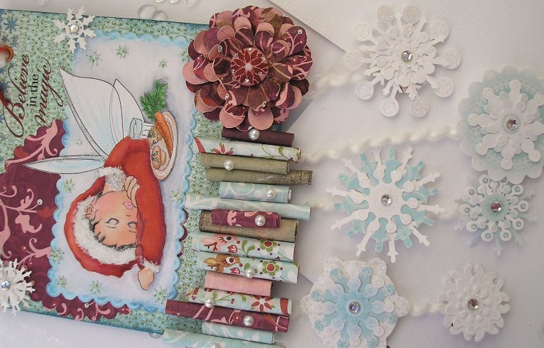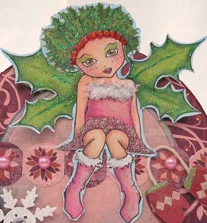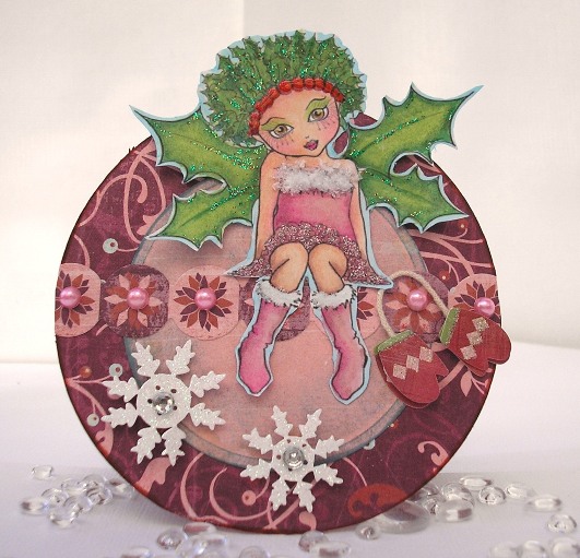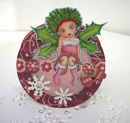 I like to shave off just the very edge of the bottom so that the card stands securely. Ink edges with red distress ink. Cut a 3" circle and glue it to the front of the card, reverse side up. Cut two 3.75" circles and glue them to the inside of the card (see pictures for guidance). Cut another 2.5" circle and glue it on the top of one of the circles inside. Add a rub-on sentiment "Warm Wishes" (Imaginisce Polar Expressions). I also added a few segments from one of the Eskimo Kisses element border stickers to the fold inside the card. Stick a Eskimo Kisses Element Border Sticker to the middle of the card front, this is where the pixie will sit later.. Stamp and colour in the Delectable Holly Pixie stamp. Add Green Stickles to the hair and wings. Add Cotton candy Stickles to the front of the dress. Add Glossy Accents to the Holly Berries and a little on her lips. Add Flowersoft Polar White to the white trimming on her dress and boots. Cut Holly Pixie out and stick her to front of the card sitting on the border. Add pink pearls to the border. If you haven't got any pink pearls then just colour some white pearls with a suitable marker pen. Finally add Mittens from the Eskimo Kisses "Pops" packet and two K&Co Swell Noel Snowflakes.