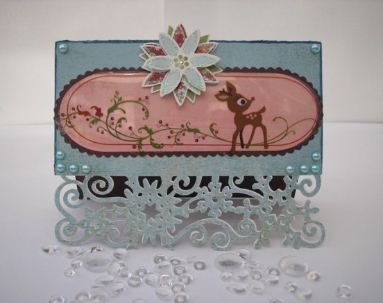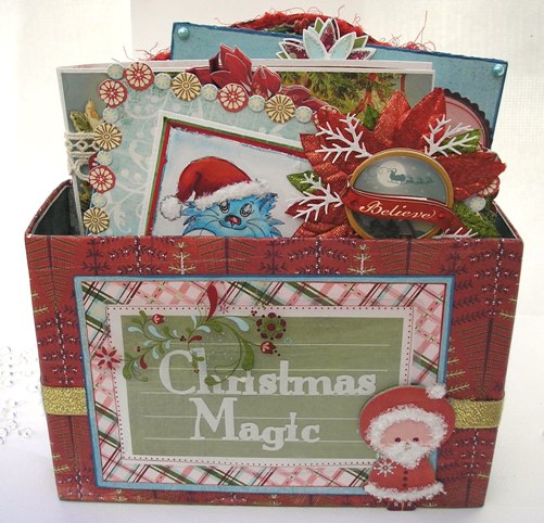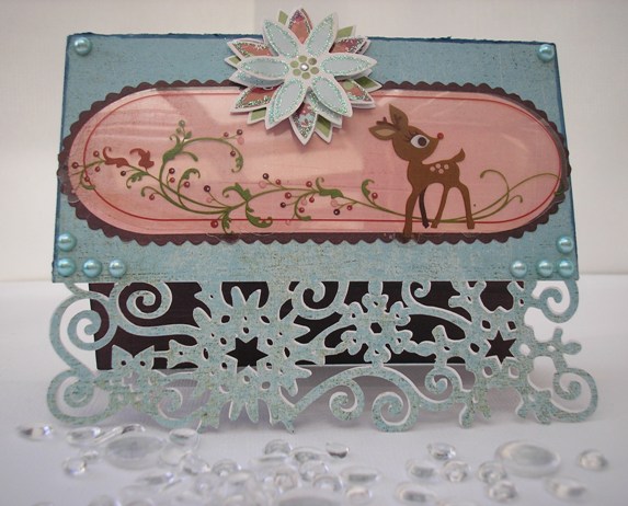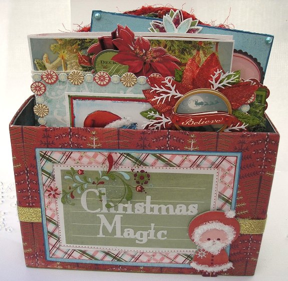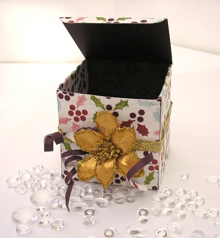 Decorate the box with gold ribbon, paper swirls and a gorgeous Prima Poinsettia.