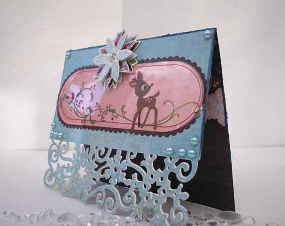 Instructions This card is cut on the Silhouette but you could also cut a lovely border using one of the Martha Stewart punches. Cut it twice and glue together for extra strength. I decorated the inside of the card with a contracting paper (Basic grey Eskimo Kisses) which looks lovely against the pale blue paper on the front and back.. A newish addition to the Basic Grey are the "Take Note" products. These are not just for scrapbooking, indeed I have used all three on other projects on this page. I used one here and it makes a gorgeous centrepiece with its lovely transparency overlay. I topped it with a Basic Grey Eskimo Kisses "Pops" sticker and a few pearls. I didn't have any blue pearls the right colours so coloured plain colours the colours I wanted with a marker.
