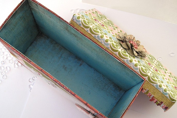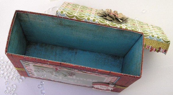Measure the inside and cut pieces of cardboard to fit. Cover them with Basic Grey Blitzen Polar Blue paper and use them to line the inside of the box. This makes it lovely and sturdy. Glue them to the bottom and sides.