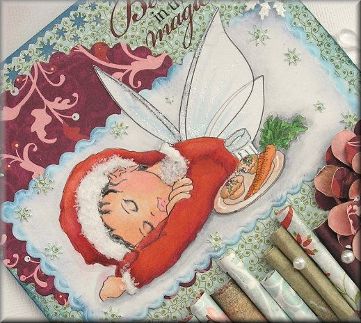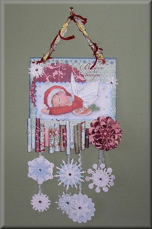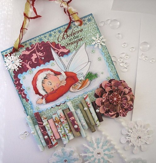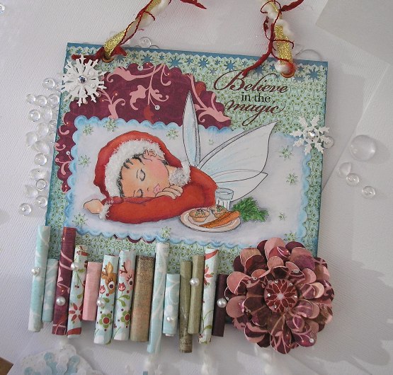 Special Tools Instructions A lovely Christmas decoration that you will treasure for years to come. Punch a starry border on a sheet of paper from the basic Grey Eskimo Kisses 6x6 Paper Pad, save the stars, we will used those later. Ink edges with blue distress ink. Stick it on a 6" x 6" piece of chipboard. Punch two holes at the top and insert two large eyelets - I used my Crop-a-dile for the job. Insert ribbon and fibre through the eyelets to hang the plaque up with. I've used another digi-stamp from the Charming Christmas collection here and coloured her in Christmas colours. Add some stickles (crystal, Icicle or similar) to the wings and Polar Soft on the hat and trimming on her top. Cut out the image in a rectangle. I used a scalloped Nestabilities die. Ink edges. Add some of the stars you punched out earlier. Cut a scalloped circle in a coordinating paper and stick it to the top left-hand corner of the frame - I used Starry Night from the Eskimo Kisses range. Add a rub-on next to it in the other corner. I used a Imaginisce Polar Expressions rub-on "Believe in the Magic". Stick on your main image frame. so that it overlaps the circle (see pictures). Make a flower using the Starry Night paper. You can find instructions on a previous project here. Stick it on the frame as shown in the pictures above. Make sure it is securely attached.