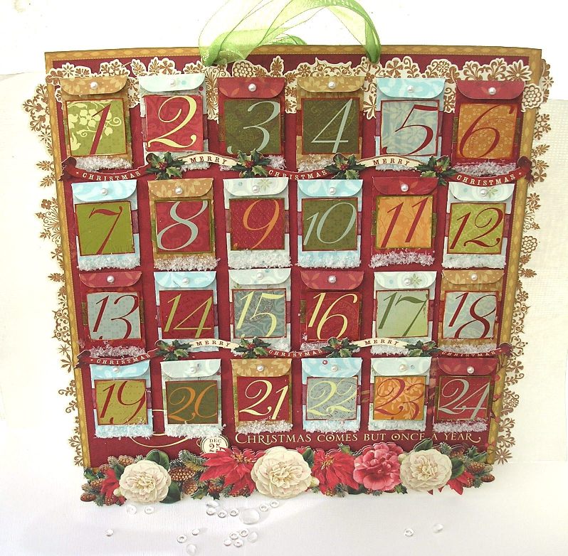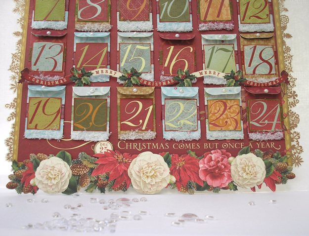 Instructions A very beautiful but incredibly economical advent calendar. Cover a 12" x 12" piece of cardboard in a sheet of 12" 12" Evergreen paper from the speciality pad. I used one that had the writing you see already on it: "Christmas comes but once a year". This paper is perfect for the calendar as it already has a golden border. Punch two holes at the top of the calendar and add two large eyelets (I used my crop-a-dile for this job). Add ribbon to hang the calendar up with. Add K&Co's Adhesive borders as you can see on the pictures. The flowers at the bottom of the calendar are also part of one of these fabulous borders. Add the golden border to the top where the envelopes go and to the sides (see picture for guidance). The Evergreen Speciality pad also has a sheet filled with numbers and icons. Cut all the numbers out. Ink the edges if you like. Using various papers from the Evergreen pad make 24 envelopes, click here for the template (not to scale). Mine are 2.5" when folded and closed. Here is how you fold them: