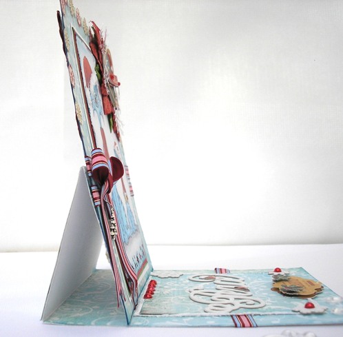 Glue the largest Basic Grey Eskimo Kisses Take Note (without the overlay) to enough red card stock for a front and back. Cut around it to form a card. Ink edges with red ink..