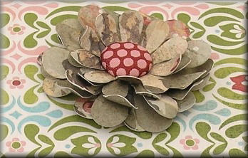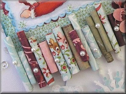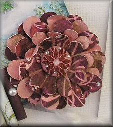 Using leftover paper roll up several pieces of Eskimo Kisses paper pieces and secure them with tape. Create enough to make a border next to the flower. Top with pearls.