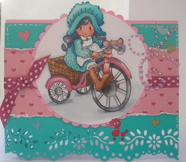 Products used: Image from the Sugar & Spice digi-stamp bundle. Paper: Basic Grey (Vintage Floral from the Sublime collection) and black plain cardstock Bows are made from black satin ribbon. Flowers are K&Co paper flowers. Sentiment is a rub-on - K&Co I think. The hearts are Fancy Pants rub-ons. I always use Distress ink for edges etc Pearls are Blue Awning pearls coloured to get the shade I wanted. I used Nestabilities for the shapes and a Tim Holtz Paper Distresser for the rough edges. |