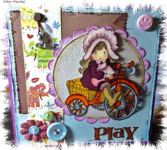 Click image to enlarge. Created by Karen Mortensen This card uses the following products: Image from the Sugar & Spice digi-stamp bundle - Basic Grey Origin Paper (6x6 paper pad on the outside and the 12x12 paper inside) - Prima Lace - Wild Saffron Leaves and Ladybirds - Pearls - Sun cut from a QuicKutz Silhouette Design (buy the Silhouette downloads to get the designs for your Silhouette) - Inside shape cut with a Nestabilities - and a Tim Holtz Paper Distresser for distressing and roughing the edges. The base card is plain cardstock.