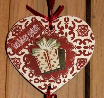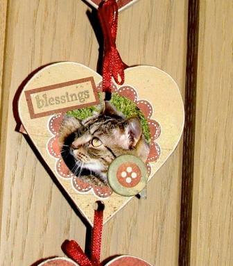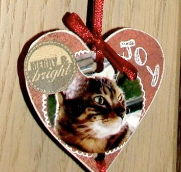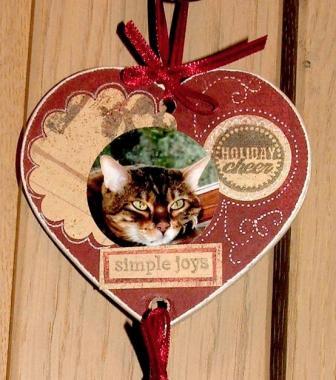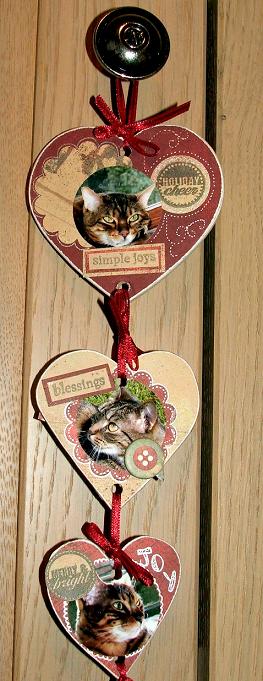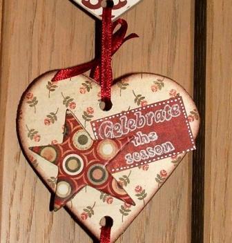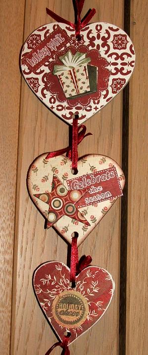 | Products used: Basic Grey Wassail Christmas Collection Quick Guide I used a wooden heart and two hand cut chipboard hearts for this simple decoration. I covered the hearts with different patterned papers and sanded the edges. I then added a whole selection of pictures, chipboard elements and stamped titles. One side has photos and the other has decorations only. I used a cropadile to punch holes top and bottom of each heart and then I linked them with red satin ribbon and bows. .
