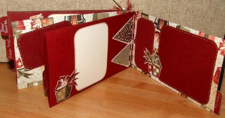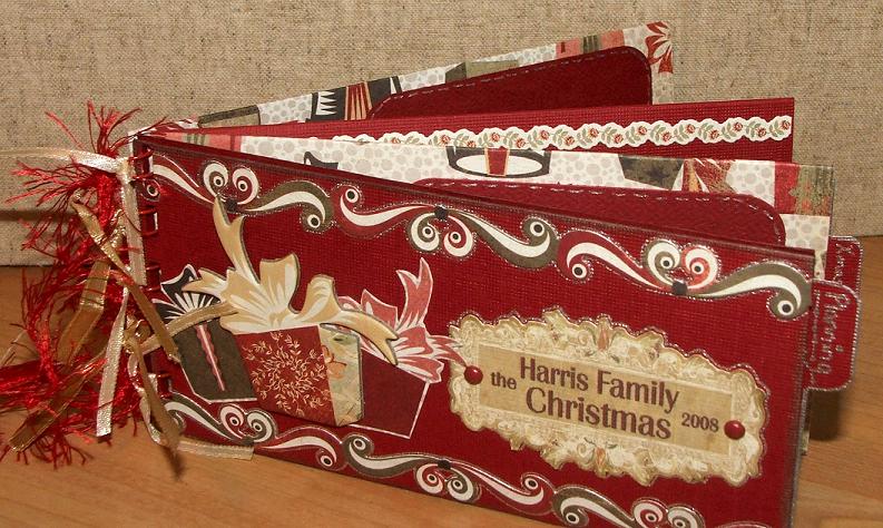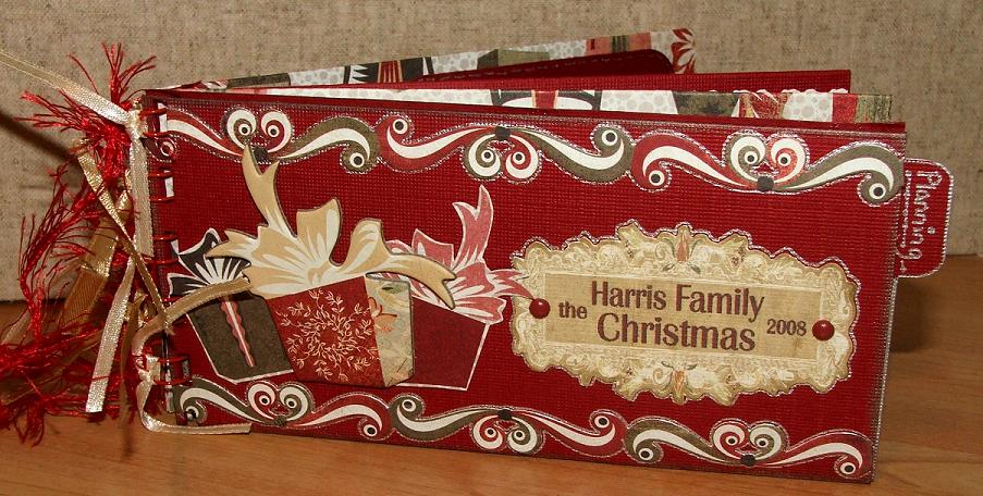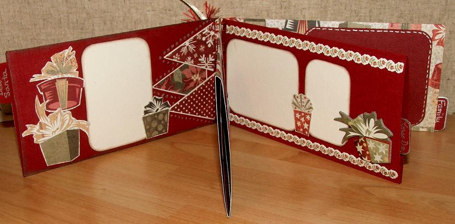 | Products used: Basic Grey Wassail Christmas Collection Instructions I am trying to encourage my god-daughter to scrap and this Christmas, now she has new baby Elinor as well, is the perfect opportunity so I wanted to make a gift book that had no pictures or journaling so that she could add her own. I made two pockets from patterned paper and two from coordinating cardstock. The pockets were simple a piece of card or paper measuring 6” wide by 6.5” long. Score the paper at 3”, and at 6” along the longest side and then you fold them into a pocket and stick the flap inside the pocket. I cut four journaling and photo cards to slip inside the pockets, edging them in silver. The front cover was decorated with stickers from the collection, presents cut from the patterned paper and a chipboard present to give dimension. I printed a title for the book and secured it with two brads. Everything was edged with silver to make it pop off the page. The inside pages were decorated with some blank mounts ready to hold pictures and presents cut from the patterned paper and mounted on foam pads. The mounts were all either edged with ink or silver faux stitching. I bound the book with a standard comb binder and threaded ribbon and fibres through the comb.