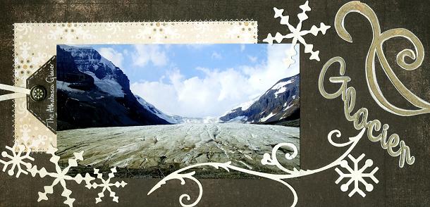 | Products used: Basic Grey Wassail Christmas Collection Quick Guide The paper had a real snowy feel and so I used one of our holiday pictures – snapped in August – of the glacier we walked on and one of the coldest places I have ever been to. I used some of the patterned paper as an offset mount, stitched to the background, which was the reverse of one of the papers in the pack, I cut snowflakes and swirls and added letter stickers for a title. There is a tag that pulls out from under the photo with the copious journaling and the paper ribbon is fixed with a snowflake brad from the collection.