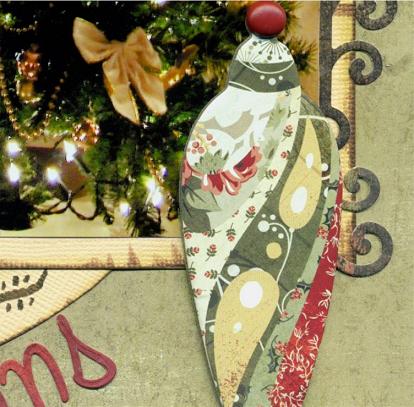 | Products used: Basic Grey Wassail Christmas Collection Instructions I loved the distressed feel of the paper collection – just right for how distressed I was with Fiki! The greens and creams went so well with our Christmas tree and even the colour of the chipboard decoration matched. I used the reverse of two of the papers for this page, inking the edges around picture mounts. The small square pictures pick out some of the details from the main picture and the arrow, cut from the same paper, calls attention to the small picture in the centre. As the page was about decorations to chipboard bauble was the perfect accent and the sticker swirl just accentuated the edge without he pictures and helped to balance it.