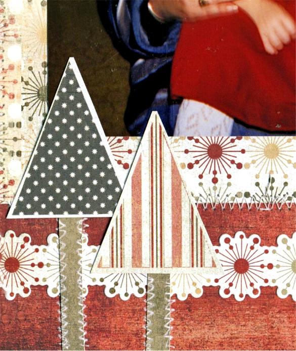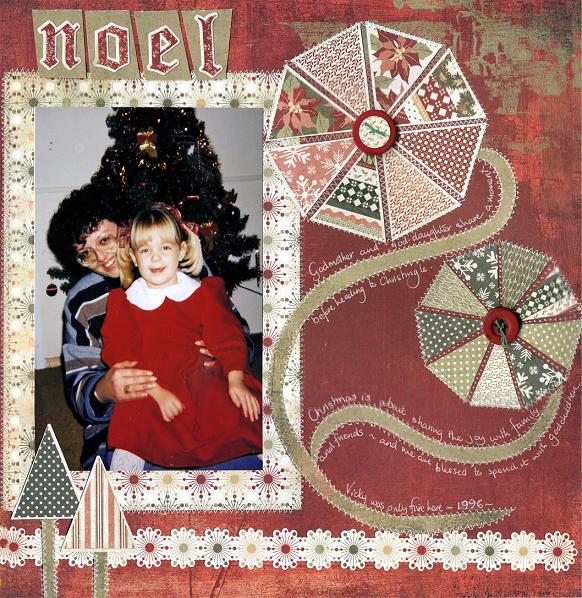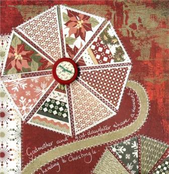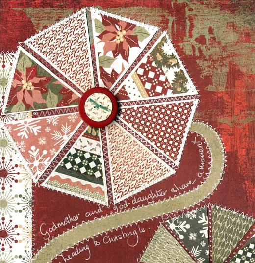 | Products used: Basic Grey Wassail Christmas Collection Instructions I loved the paper with all the different triangles in loads of different patterns, but was scared by how patterned it was, so I used my trusty old technique of cut it up and see what happens. When I cut lots of the triangles out they automatically made themselves into geometric flower shapes, but with a Christmassy feel because of the papers. I mounted the picture of my god-daughter and I on patterned paper and then stitched it onto the background, which was the reverse or plain side of one of the sheets. I stuck the two geometric flower designs in place and then sewed round the edges and added silver faux stitching or dots in between the triangles. I drew and cut two swirls for stems from the reverse side of the photo mount paper and faux stitched along their edges with a white pen. I added my journaling following the lines of the stems as well. The title was made using stickers from the sticker sheet mounted onto the same green paper. I couldn’t resist adding two more triangles as small trees at the bottom.