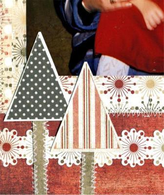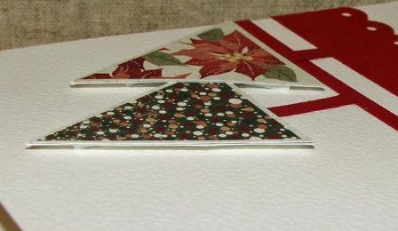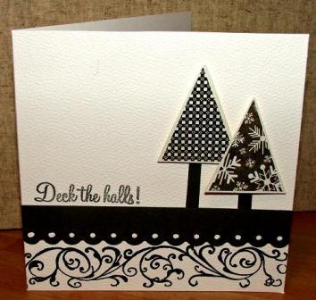 | Products used: Basic Grey Wassail Christmas Collection Quick Guide The triangular patterned paper was screaming out ‘Christmas Trees’ and the cards were so simple to make but have a stylish modern feel. On the black and white card I used a stamp along the bottom and then a piece of scallop edged paper. On the red card I just used scallop edged paper. In both cases the ‘trees’ were mounted onto thick card and then raised on foam pads.