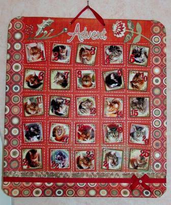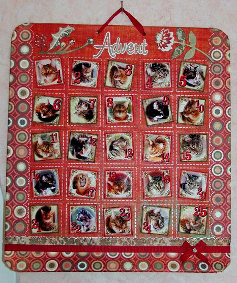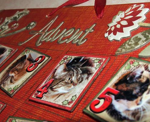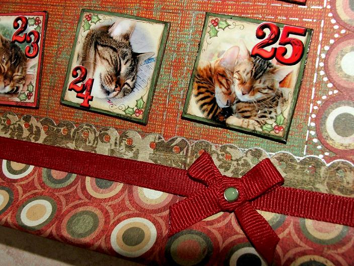 | Products used: Basic Grey Wassail Christmas Collection Instructions The base of the tray is a non stick baking sheet. Non stick means just that – so be prepared to use a lot of strong double sided tape. The first thing I did was make the tiles. I used photos of the cats and added numbers digitally to the tiles. When printed they were mounted on thick chipboard, inked around the edge and a small magnet was stuck onto the back of each finished tile. I covered the baking sheet with the red paper and then marked 25 squares (5 rows of 5) in faint pencil, measuring carefully so the squares were approximately 1” up from the bottom and 1” in from each side. The sizes will vary according to the size of your baking sheet and the size you want to make your tiles. My squares were 4.5 cm and my tiles were 4cm Once you are happy with the squares go over the pencil marks with a journaling pen. I used a silver pen as mine was a dark paper but you could use black, white or gold depending on what you use for the background. I cut strops from the circle paper and cut round the edge circles to give a fancier edge and then stuck them along the bottom and the sides. I also added the scallop sticker along the bottom edge and a piece of ribbon and a bow, fixed with a Wassail brad. I wanted the edge covered so I folded the paper over the edge and stuck it down on the back of the tray. I used some of the letter stickers for my title and edged them with silver pen. I also added two of the chipboard flower and holly sprigs to finish off the top. I drilled two holes through the top and added matching ribbon to hang the calendar.