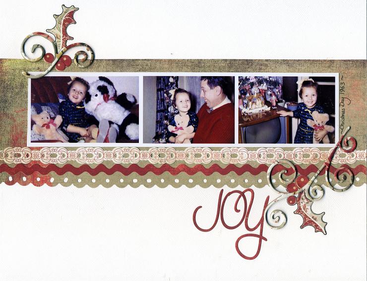 | Products used: Basic Grey Wassail Christmas Collection Quick Guide I wanted to use some very poor quality pictures that didn’t stand up well to being printed in a large format. I cropped them and joined them in one long strip in a photo editing programme then printed the strip. I mounted the strip onto a piece of the patterned paper, scalloped the edge and added two of the edge stickers. I added two of the chipboard swirls and some of the holly leaf stickers and finished the page with letter stickers and the date down the side. It was an easy way to use poor quality old photos.