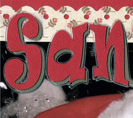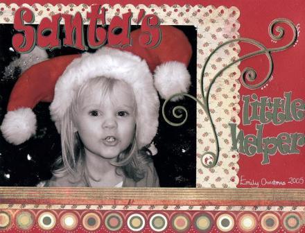 | Products used: Basic Grey Wassail Christmas Collection Instructions I loved the picture of Emily in her Santa hat, but the other colours in the picture were too garish (why would she have a pink jumper on with a red hat!!!) so the solution was to colourise the picture in PSE and just spot colour the hat. I cut a piece of the patterned paper so that both that and the photo fitted flush with the edge of the page and I used a threading water punch to scallop the other two edged to give some definition. I added strips of two other patterned papers along the bottom and a chipboard swirl, outlined in silver pen, along the side of the image. I cut the title using a coordinating card and edged that in silver as well.