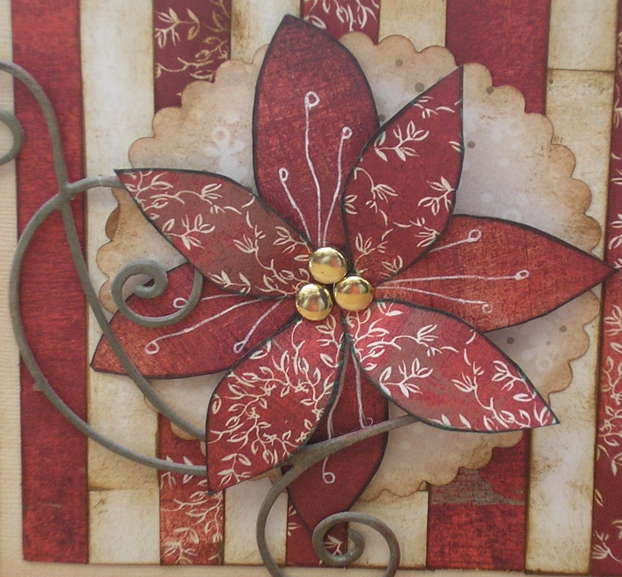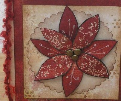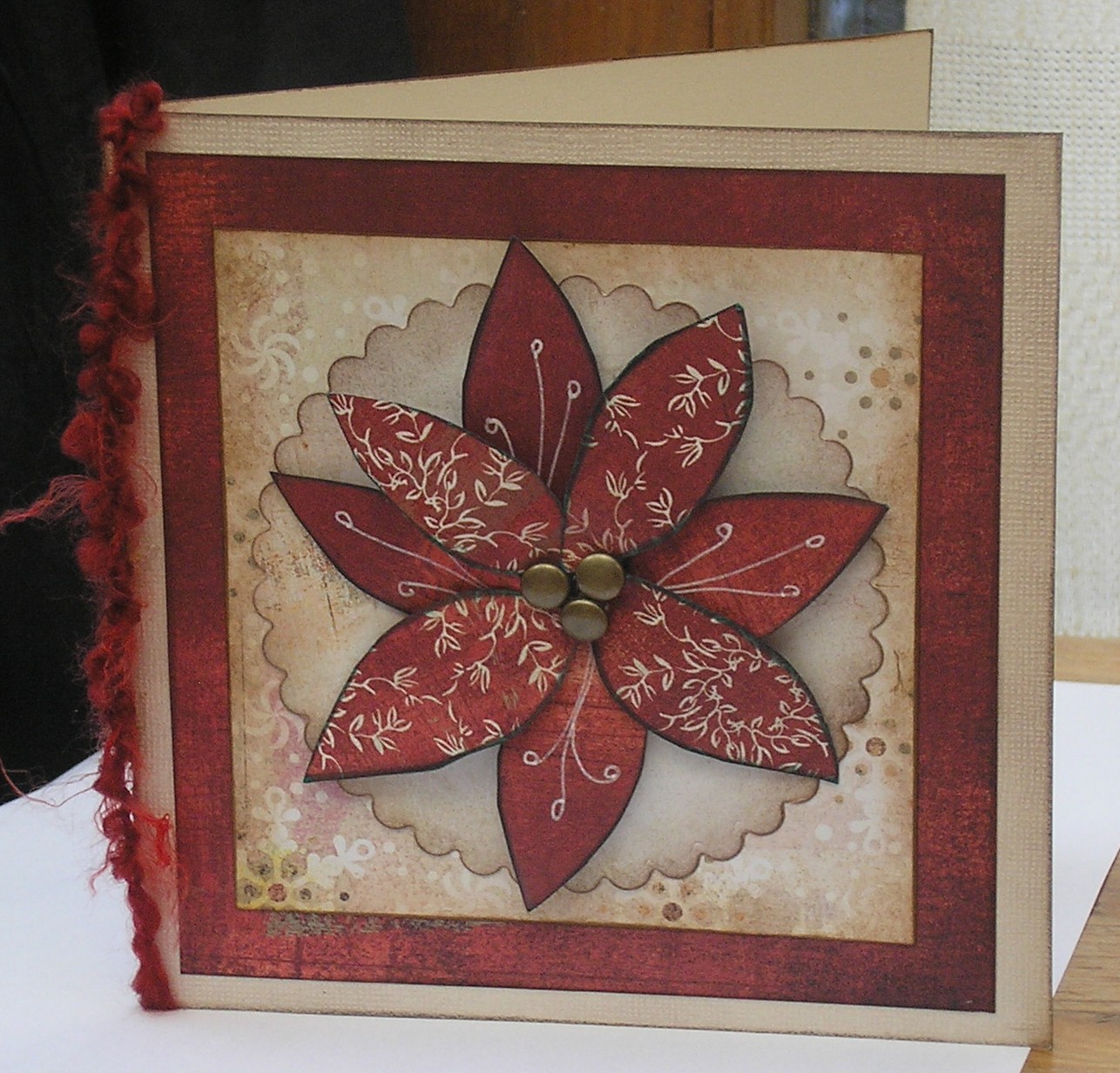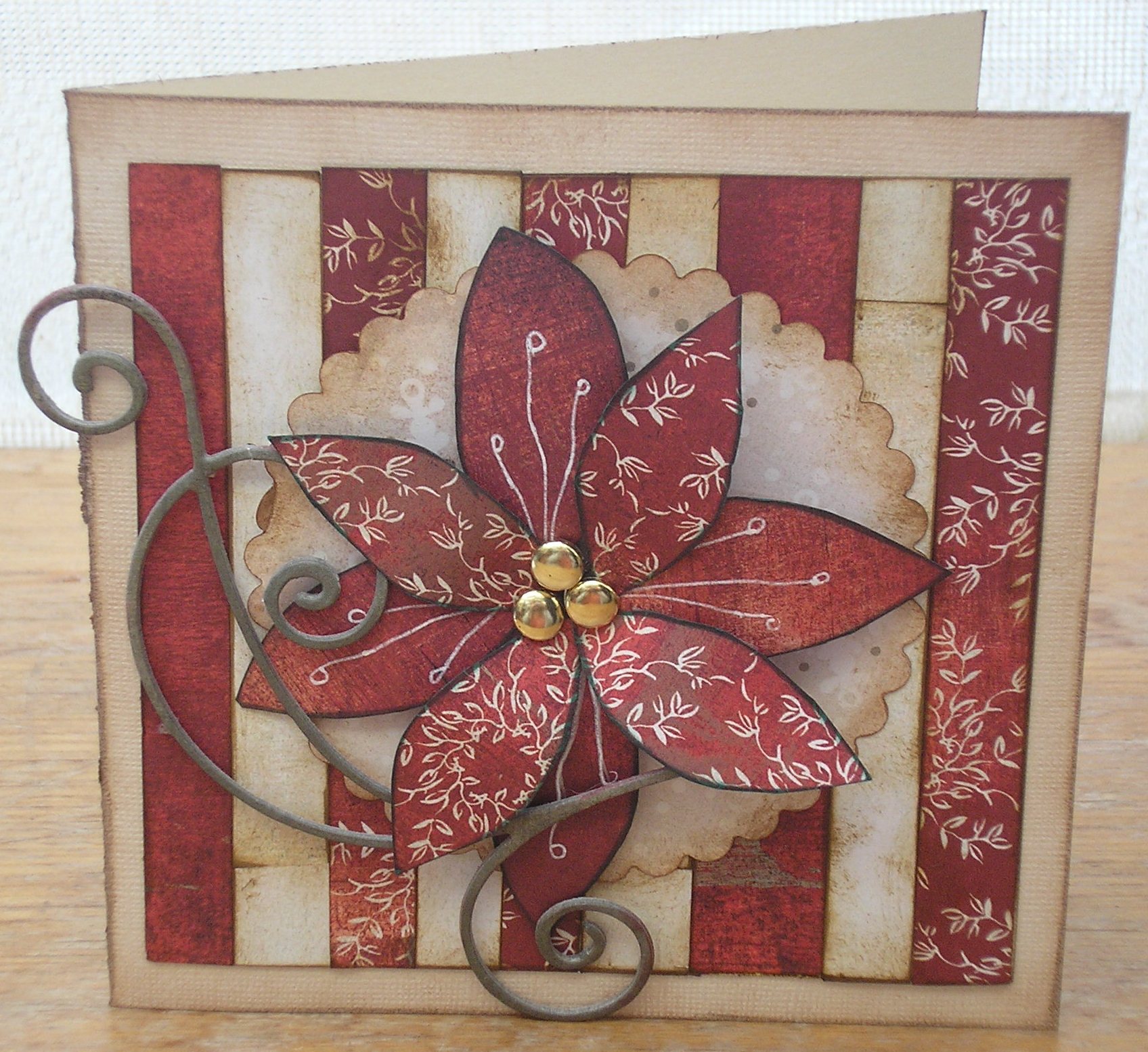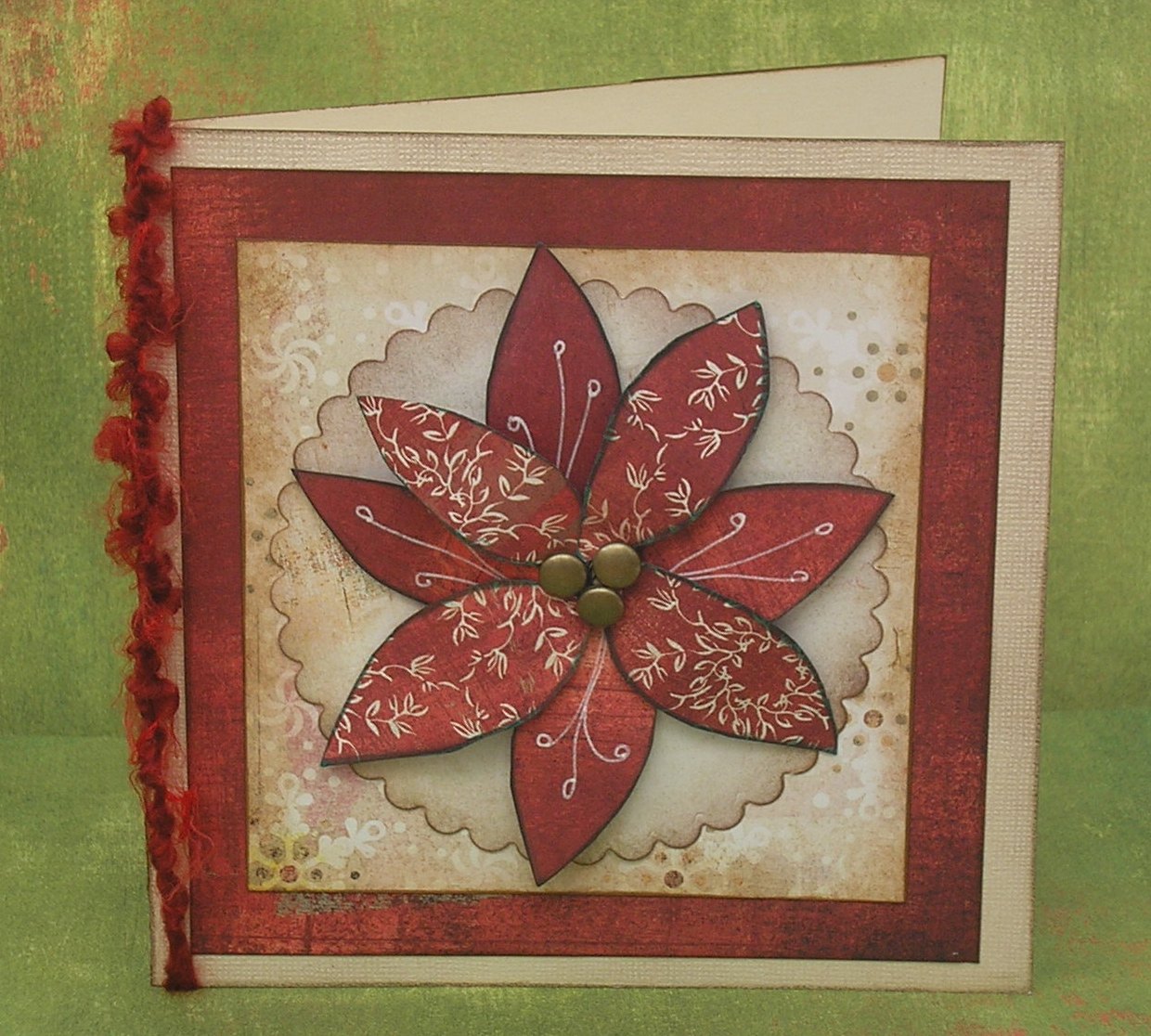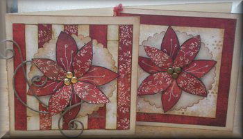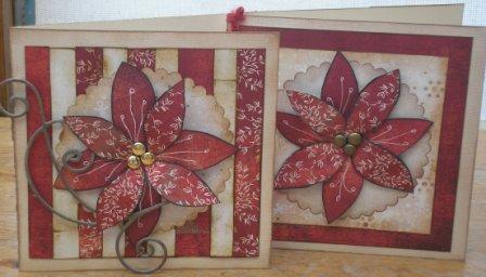 | Products used: Basic Grey Wassail Christmas Collection Instructions These lovely cards are sure to impress this Christmas. Both uses a large handmade Poinsettia flower as the focal point. To make the flower draw and cut out eight petal leaves from Wassail Paper. Doodle a little on the plain petals if you like. Ink all edges in brown Distress ink. Tape a small piece of florist wire onto the back of the petal, I used the very fine wire, this means you can bend the petals into position. Alternate the petals as pictures merging all the wires in the centre. To finish off the flower add three large brads.
