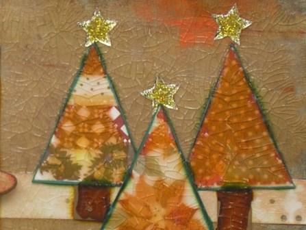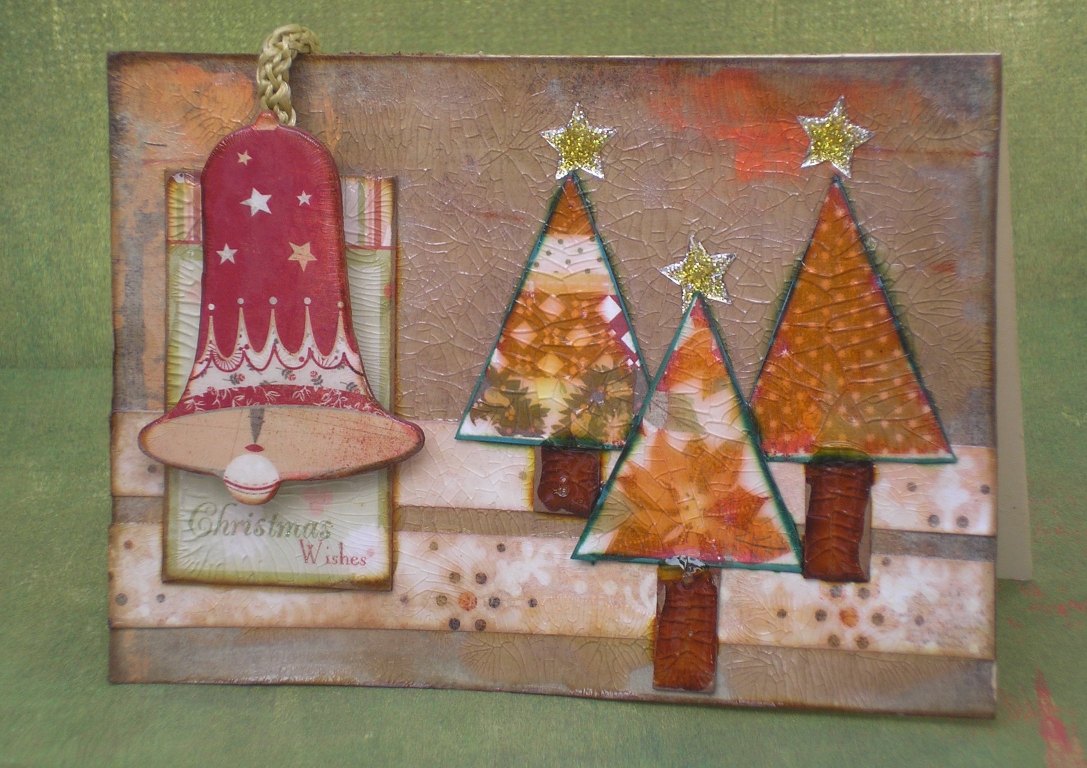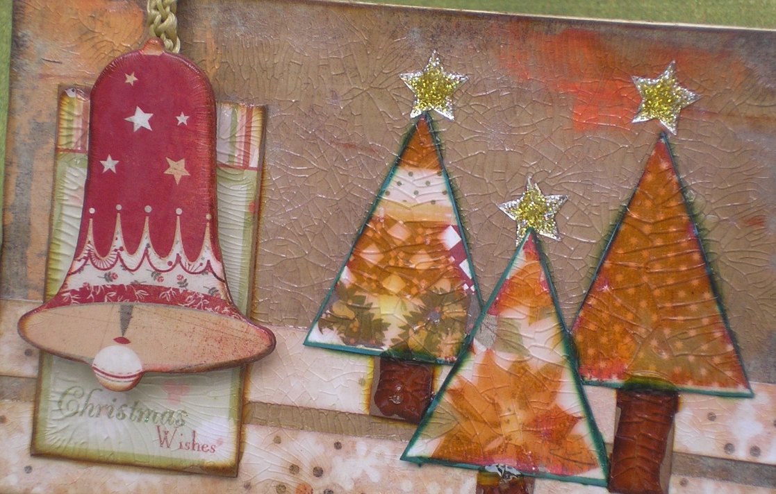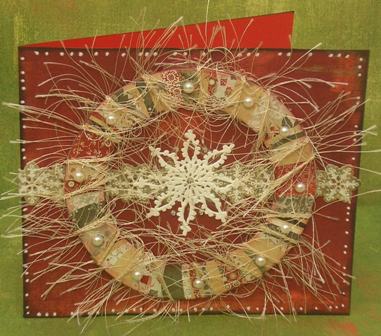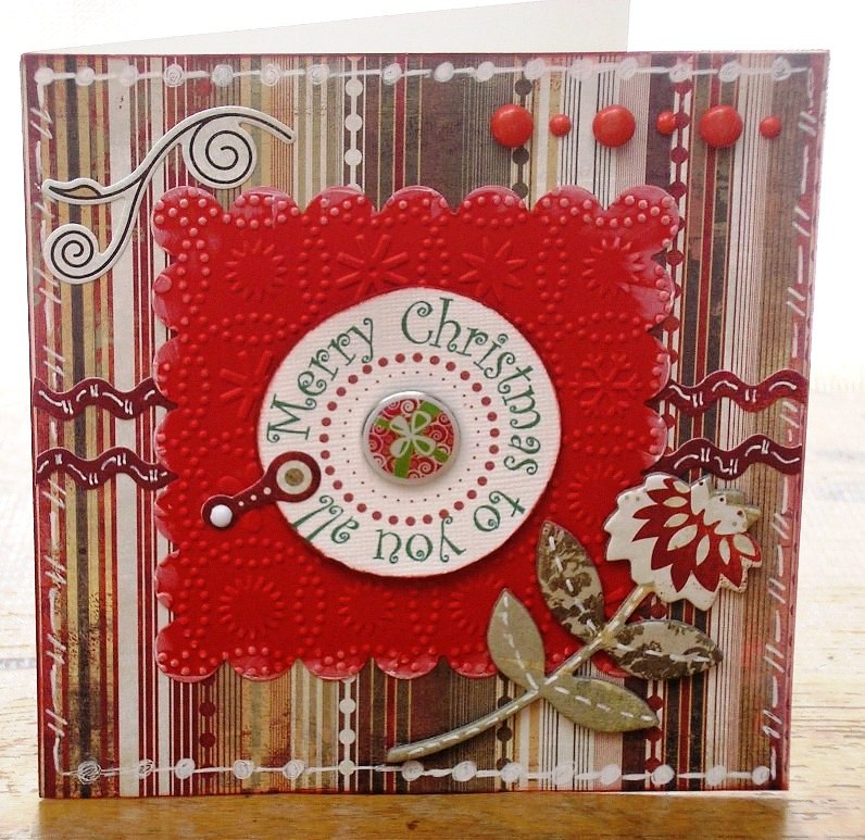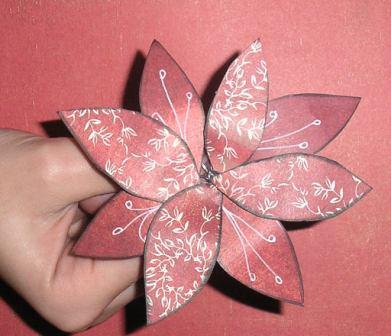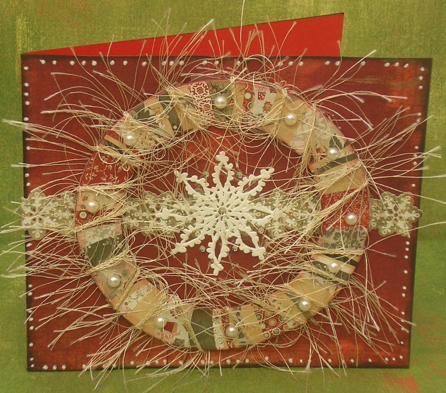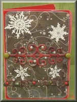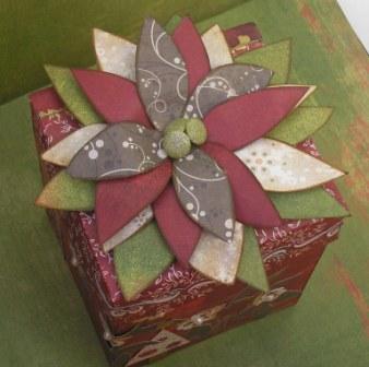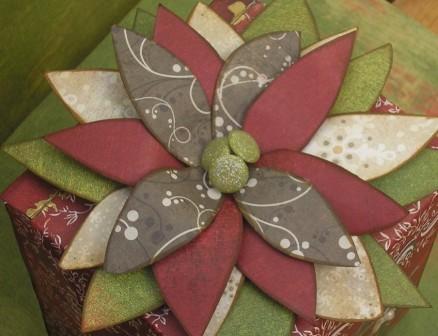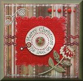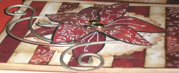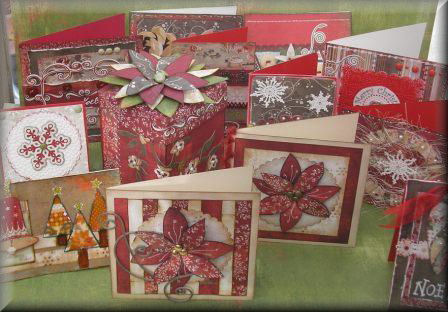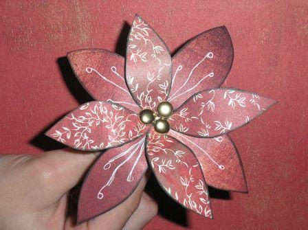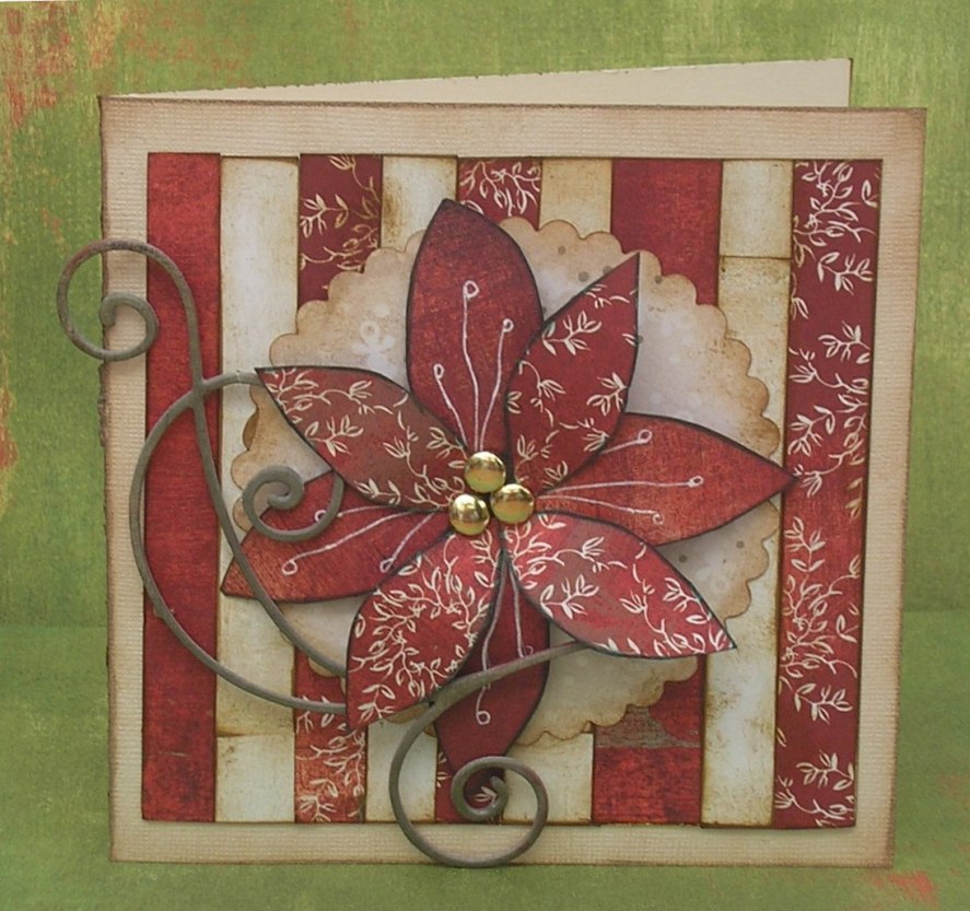 | Products used: Basic Grey Wassail Christmas Collection Instructions These lovely cards are sure to impress this Christmas. Both uses a large handmade Poinsettia flower as the focal point. To make the flower draw and cut out eight petal leaves from Wassail Paper. Doodle a little on the plain petals if you like. Ink all edges in brown Distress ink. Tape a small piece of florist wire onto the back of the petal, I used the very fine wire, this means you can bend the petals into position. Alternate the petals as pictures merging all the wires in the centre. To finish off the flower add three large brads.
