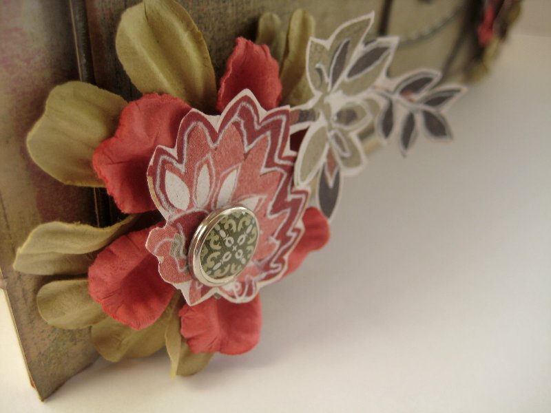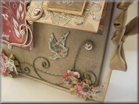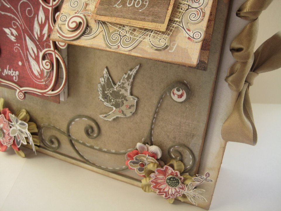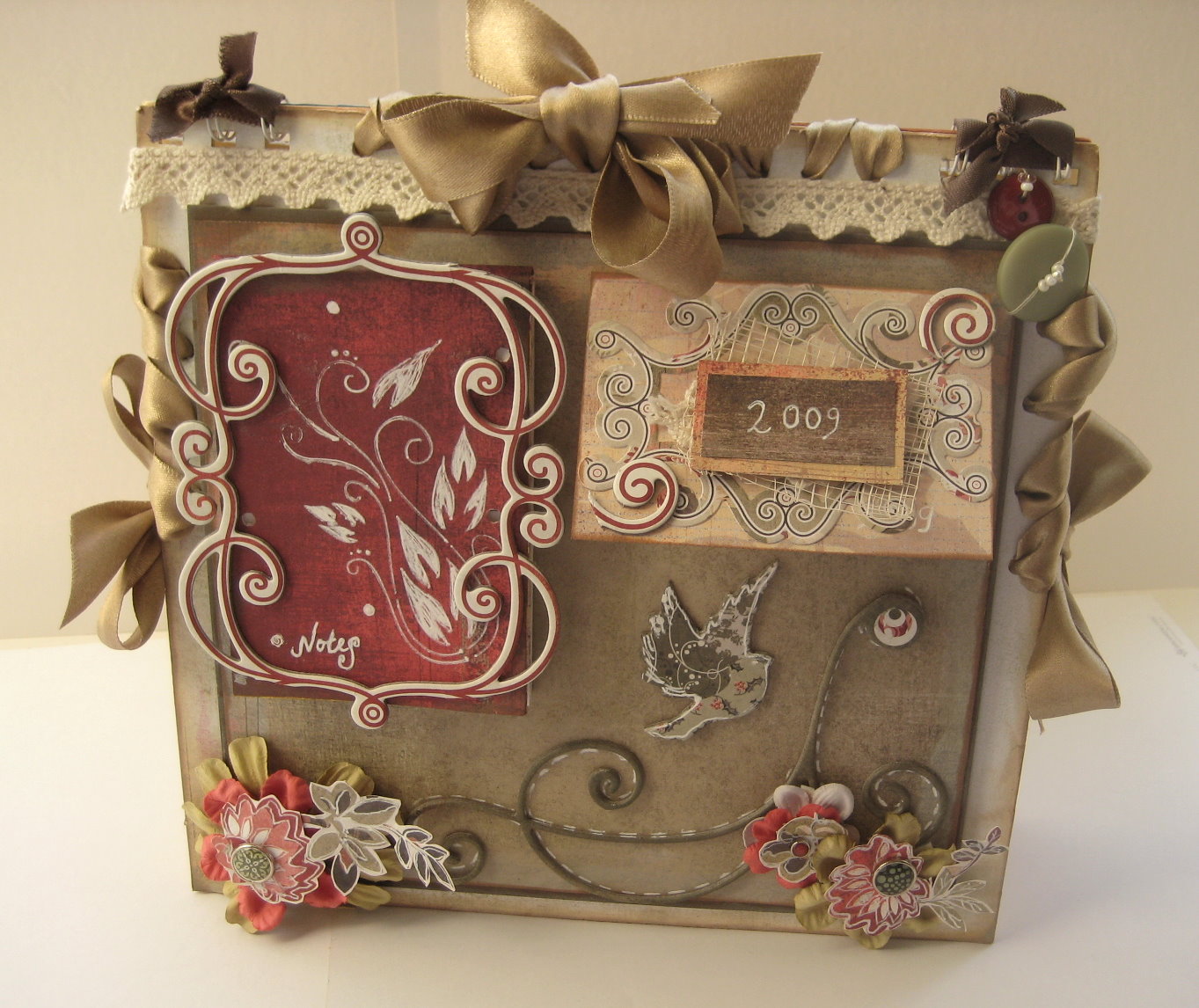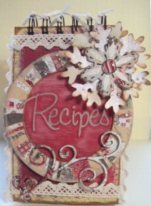 chipboard circle middle. Attach circle to the red distressed side of the wassail paper. Attach your letter stickers to say Recipes in the middle of the circle. Attach your lace to the top and bottom of the front cover. Attach the chipboard flourish . Using a jumbo snowflake ,, ink the edges in brown. (can be one punched out snowflake) attach a chipboard snowflake to the middle and use a brad in the centre.