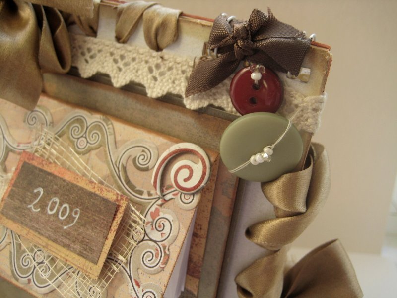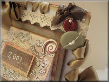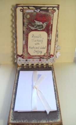 1st page of each recipe is the name of the recipe . ONLY on the first page I edged with lace. Then I used a wassail patterned side and a slightly smaller distressed side . I used a paint dauber on all the edges then inked them. I used stickers to decorate the bottom of the page. I attached the distressed side to the patterned side mounting it . I used a brad in two corners . I cut out a cream square , and snipped off the corners . I wrote the name of my recipe and attached it to the mounted background.