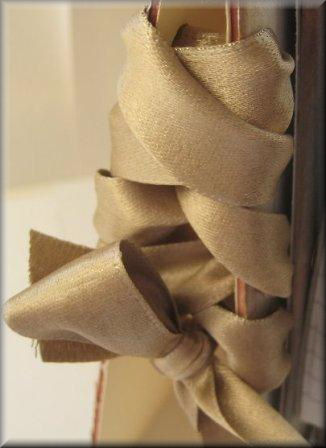 Tie and bow brown ribbon to the wires at each end of the cover .